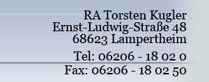 Rechtsanwalt, Notar, Kanzlei, Rechtsanwaltskanzlei, Notarkanzlei, KUGLER, Lampertheim, allgemeines Vertragsrecht, Mietrecht, Kaufrecht, Erbrecht, Testament, Erbvertrag, Pflichtteilsrecht, Erbausschlagung, Testamentsvollstreckung, Insolvenzrecht, Familienrecht, Eherecht, Unterhaltsrecht, Vermögensnachfolge, Vorsorgevollmacht, Patientenverfügung, Immobiliarrecht, Wohnungseigentumsrecht, Gesellschaftsrecht, Umwandlungsrecht, Ausgliederungsrecht, Vereinsrecht, Straßenverkehrsrecht, Luftfahrtrecht
